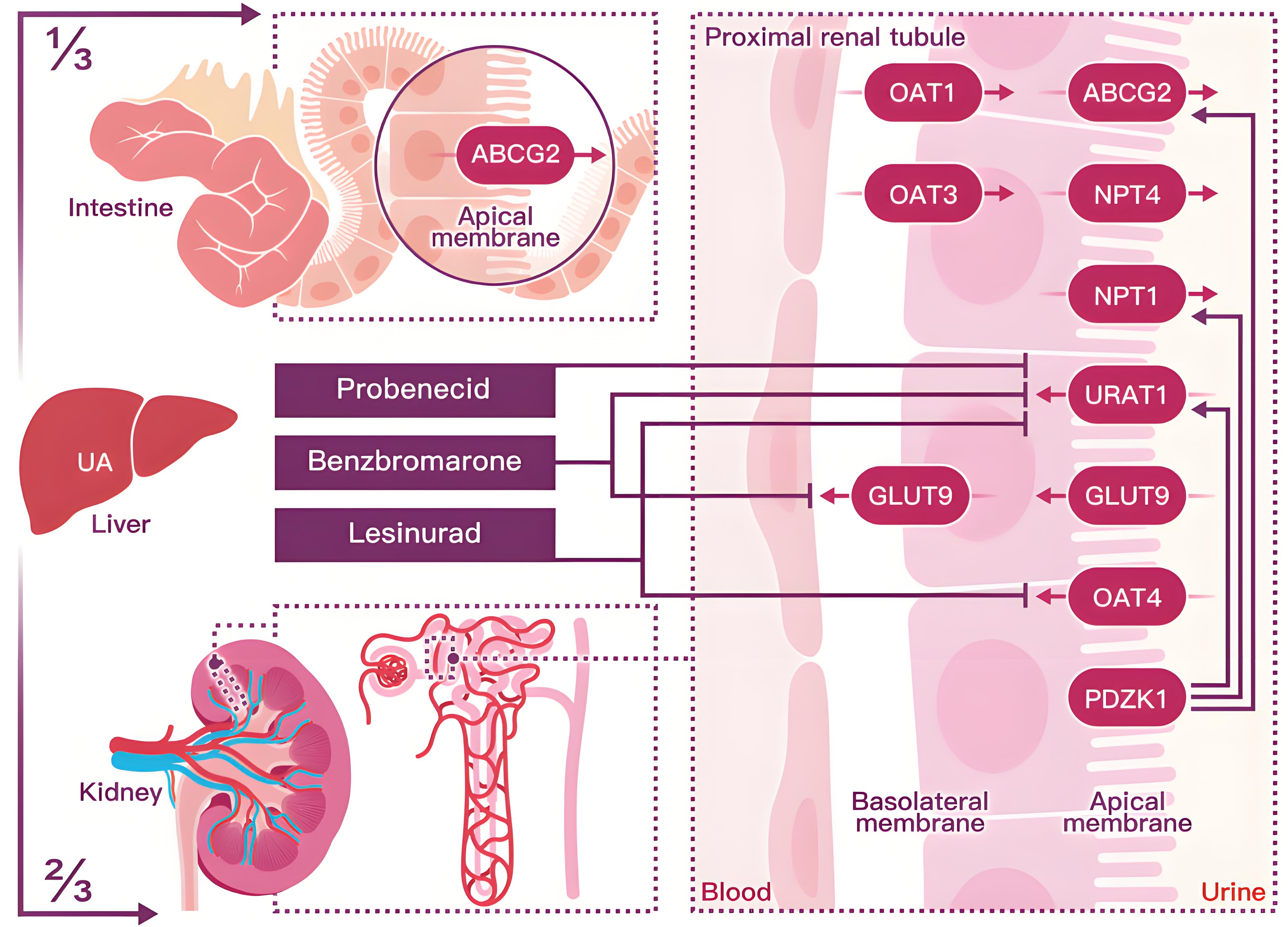 它们仨堪称管控尿酸的“铁三角”,任何一个部位出问题,对于尿酸合成和代谢都会造成严重影响。