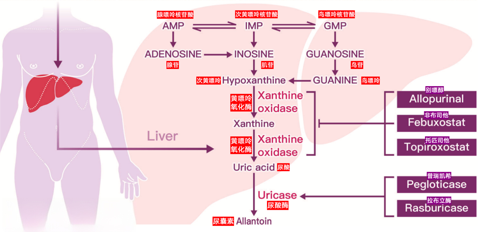 黄嘌呤氧化酶(XO)是尿酸生产的关键酶,不管是什么来源和形式的嘌呤要生成尿酸,都要经过黄嘌呤氧化酶这一步。而且目前一线的降尿酸药物,比如别嘌醇、非布司他、托匹司他等,也都是针对XO发挥药效。