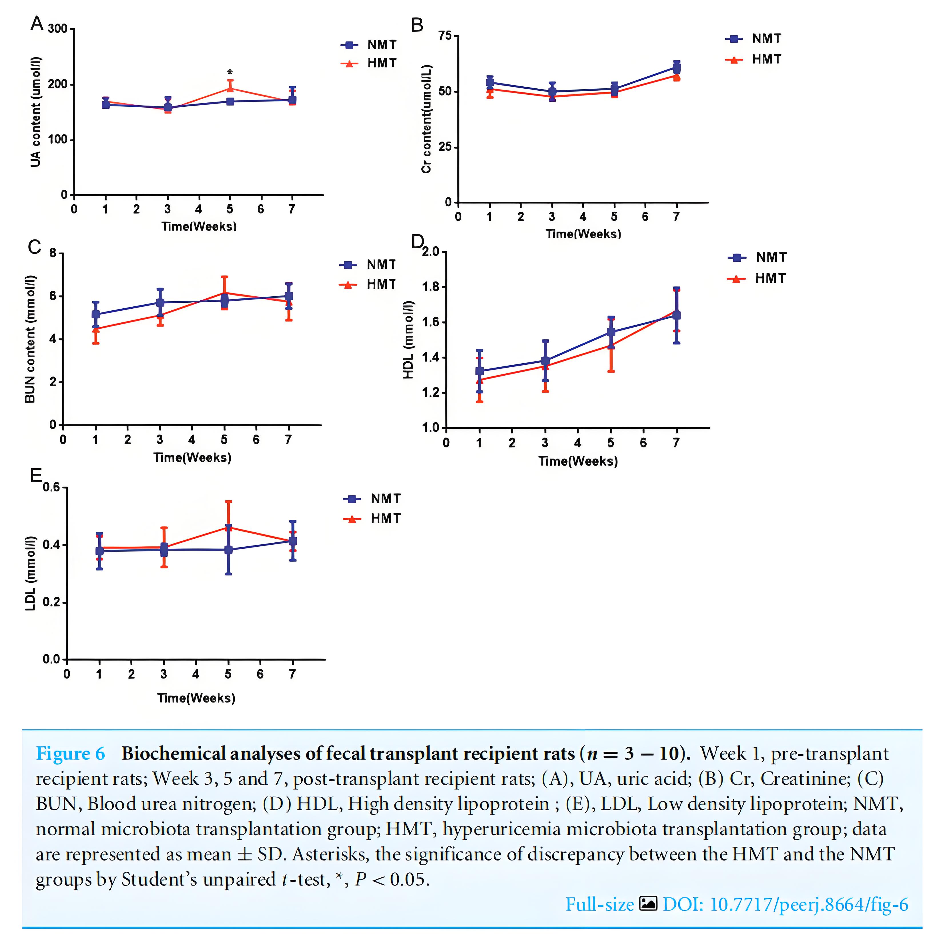 一项动物实验也印证了这一点:将患有高尿酸血症的动物粪便菌群和健康菌群,分别移植到经抗生素处理过的无菌大鼠体内。结果发现移植高尿酸菌群的试验组的大鼠,在第三周尿酸水平开始出现明显上升,而对照组无明显变化。